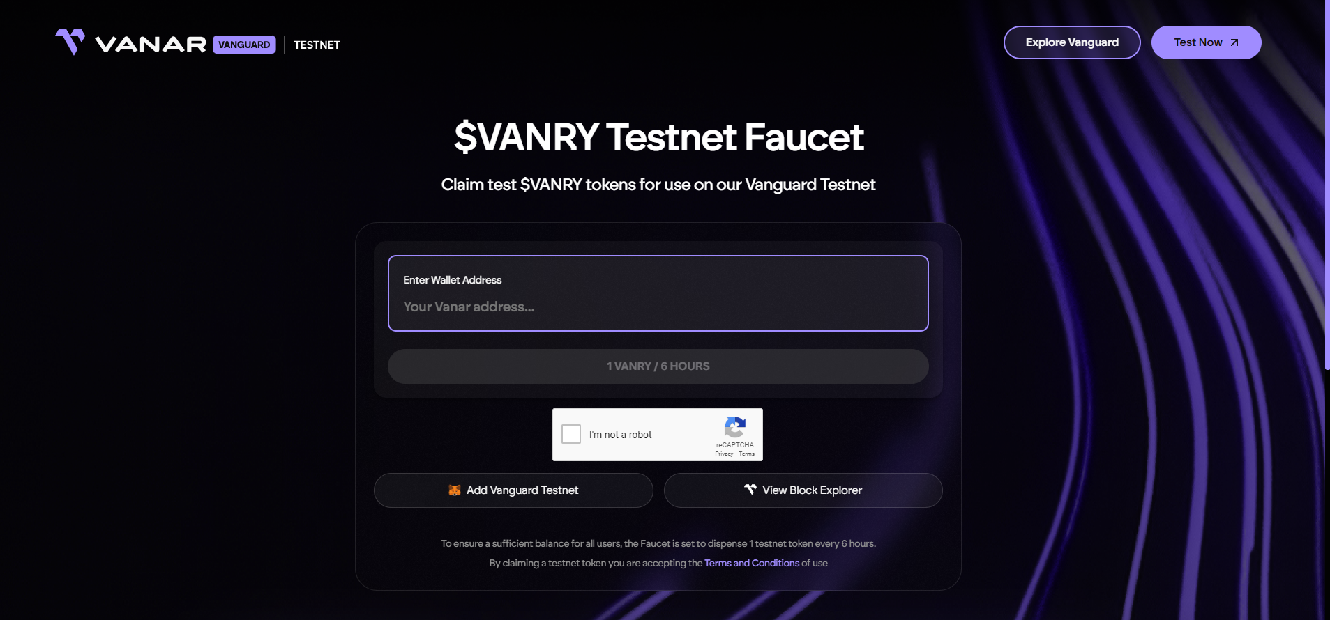Enter Your Address: Users input their Vanguard testnet wallet address where they wish to receive the tokens.