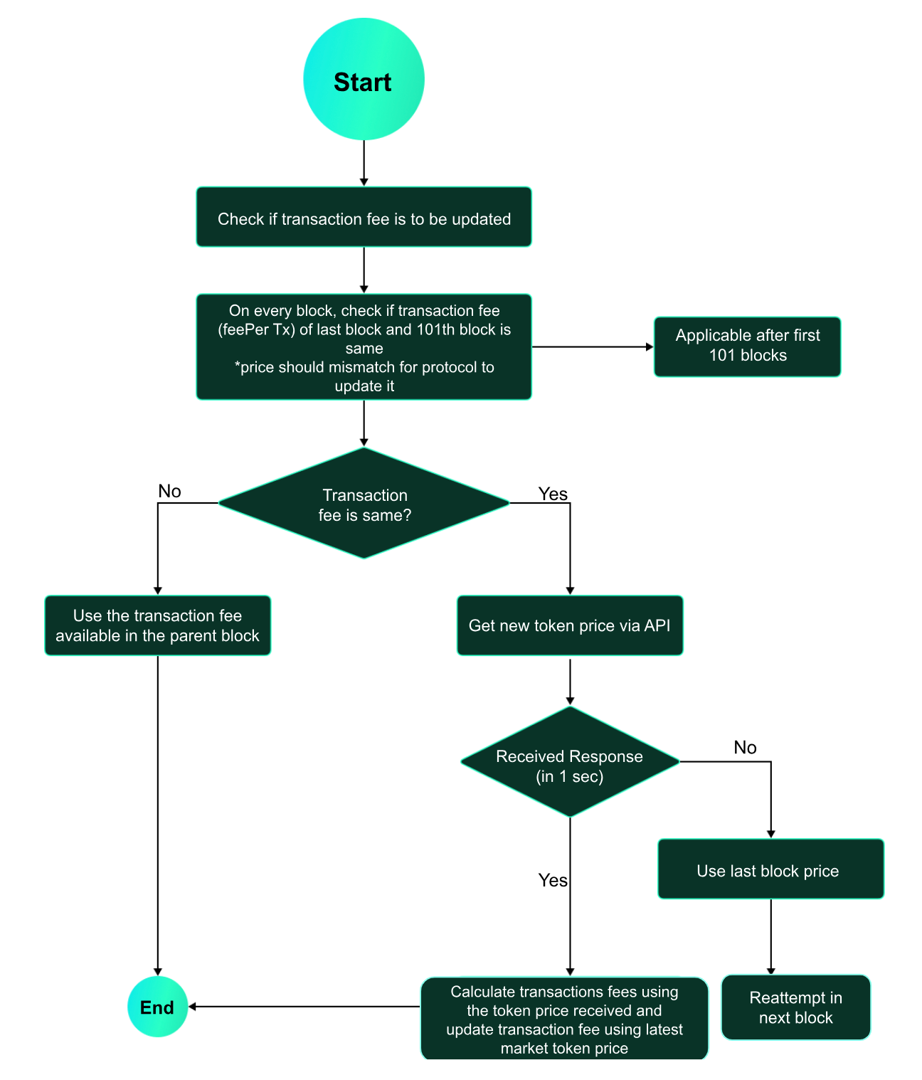 Below is the workflow showing how the transaction fees get updated in the protocol every 5 minutes based on the market value of the native gas token. This is supported by the VANRY Token Price API that helps the protocol to know the market value of the native gas token at any given moment.